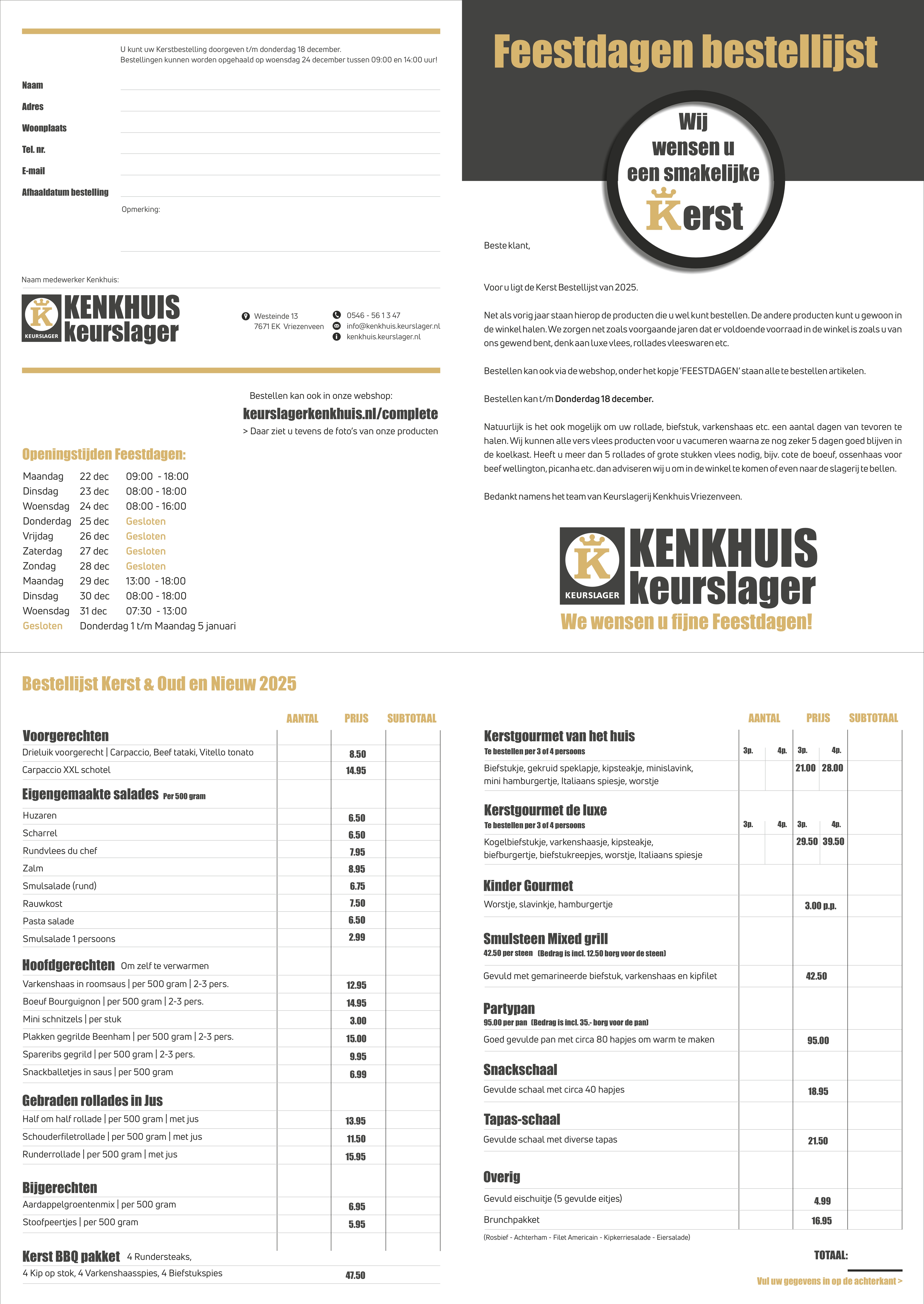 Op onze feestdagen bestellijst staan producten die u kunt bestellen. De andere producten kunt u gewoon in de winkel halen. We zorgen net zoals voorgaande jaren dat er voldoende voorraad in de winkel is, zoals u van ons gewend bent, denk aan luxe vlees, rollades, vleeswaren, etc.